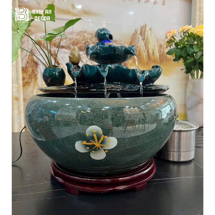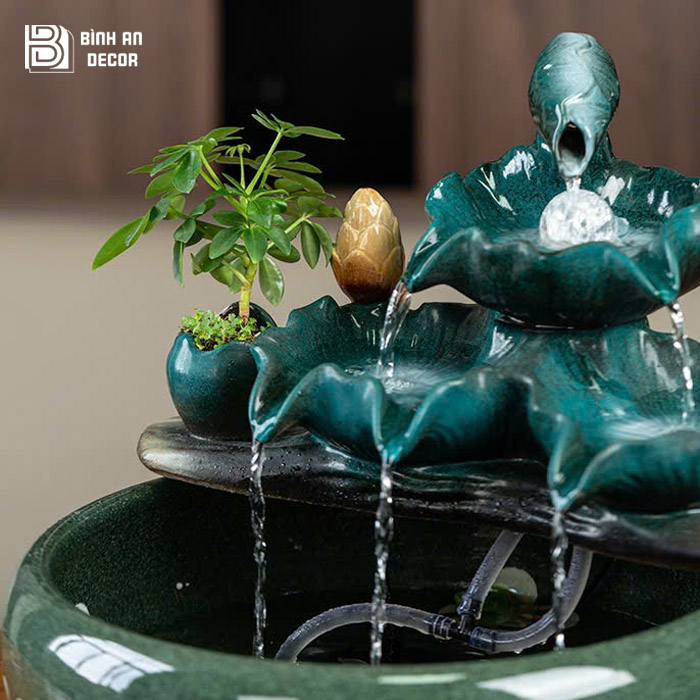 Sản phẩm được chế tác tỉ mỉ với độ hoàn thiện cao, bề mặt men đẹp, màu sắc bền và tính thẩm mỹ sang trọng. Chất liệu chắc chắn giúp thác nước vận hành ổn định, bền đẹp theo thời gian. Không chỉ đơn thuần là vật phẩm phong thủy, mẫu thác nước lá sen xanh còn được xem như món decor cao cấp giúp nâng tầm không gian sống, đồng thời mang lại giá trị sử dụng và giá trị thẩm mỹ lâu dài.