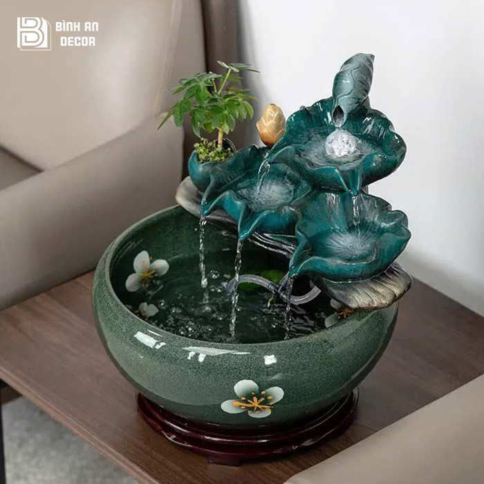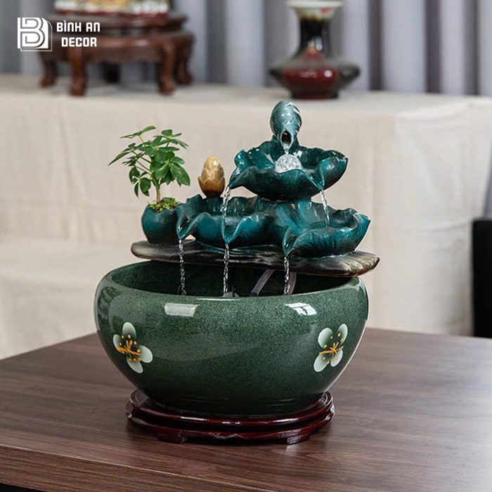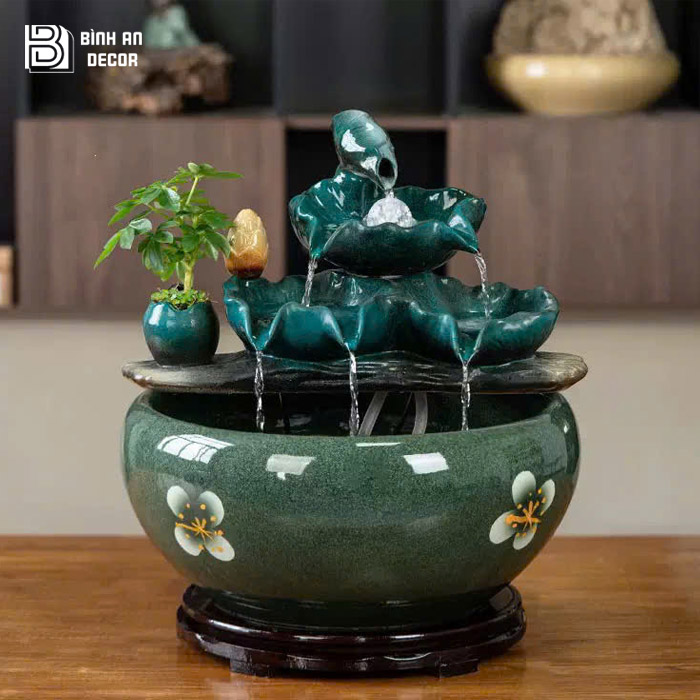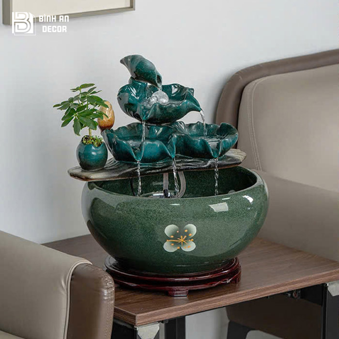 Sản phẩm tại Bình An Decor được tuyển chọn kỹ về kiểu dáng chất lượng hoàn thiện và yếu tố phong thủy, giúp khách hàng không chỉ sở hữu một món decor đẹp mà còn chọn được vật phẩm phù hợp để kích hoạt tài lộc, tăng vượng khí cho không gian. Ngoài mẫu thác nước lá sen xanh, cửa hàng còn có nhiều mẫu thác nước mini phong thủy đa dạng về kiểu dáng, kích thước và mức giá để khách hàng dễ dàng lựa chọn theo nhu cầu.
